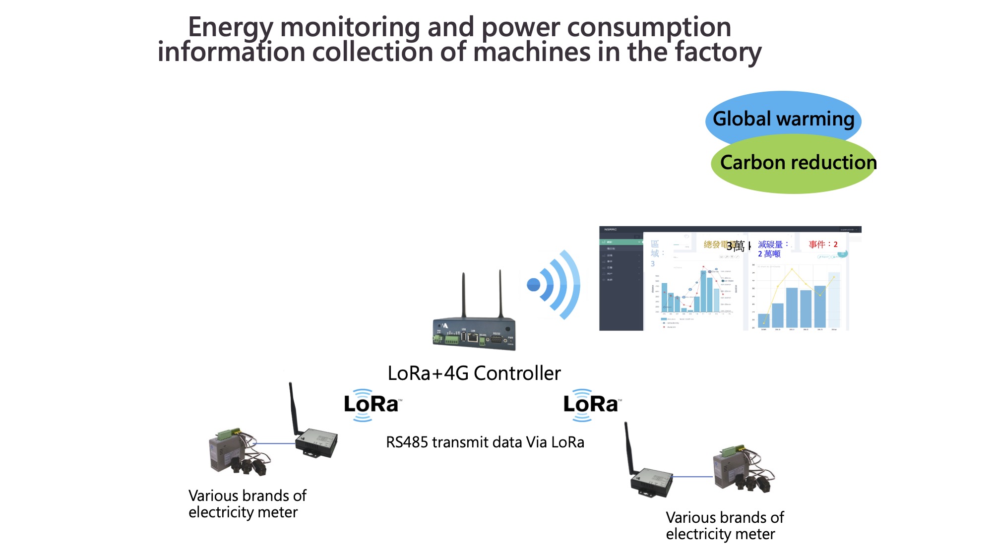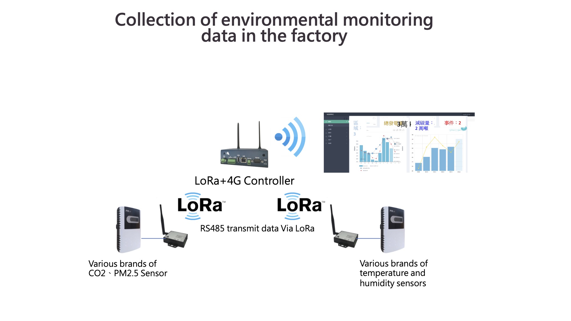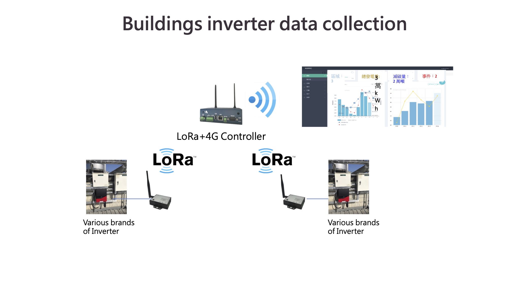 1. 廠區各位置多個環境感測器、逆變器、電錶,透過LoRa傳輸至控制器,回傳伺服器