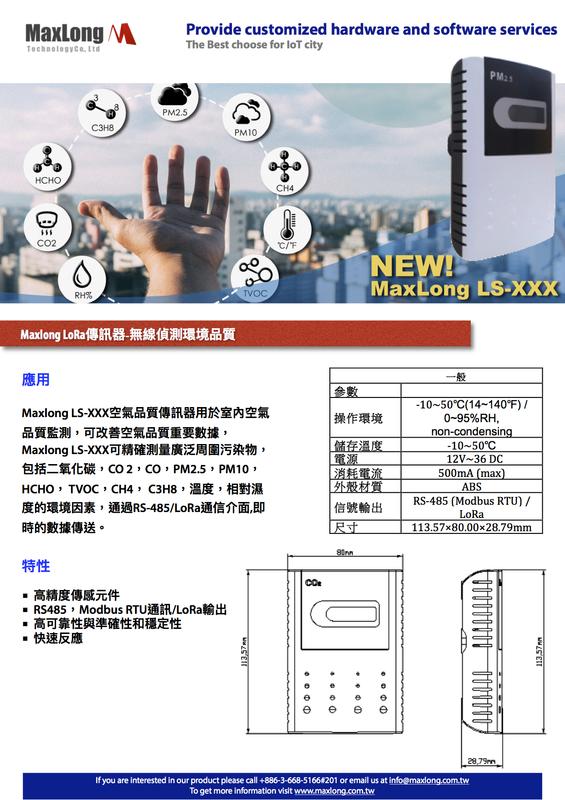 Maxlong LS-xxx air quality sensor is used for indoor air quality monitoring, which can modify important air quality data. Maxlong LS-xxx can accurately measure a wide range of ambient pollutants, including carbon dioxide, CO2, CO, PM2.5, PM10, HCHO, TVOC , CH4, C3H8, environmental factors such as temperature and relative humidity, real-time data transmission through the RS-485/LoRa communication interface.